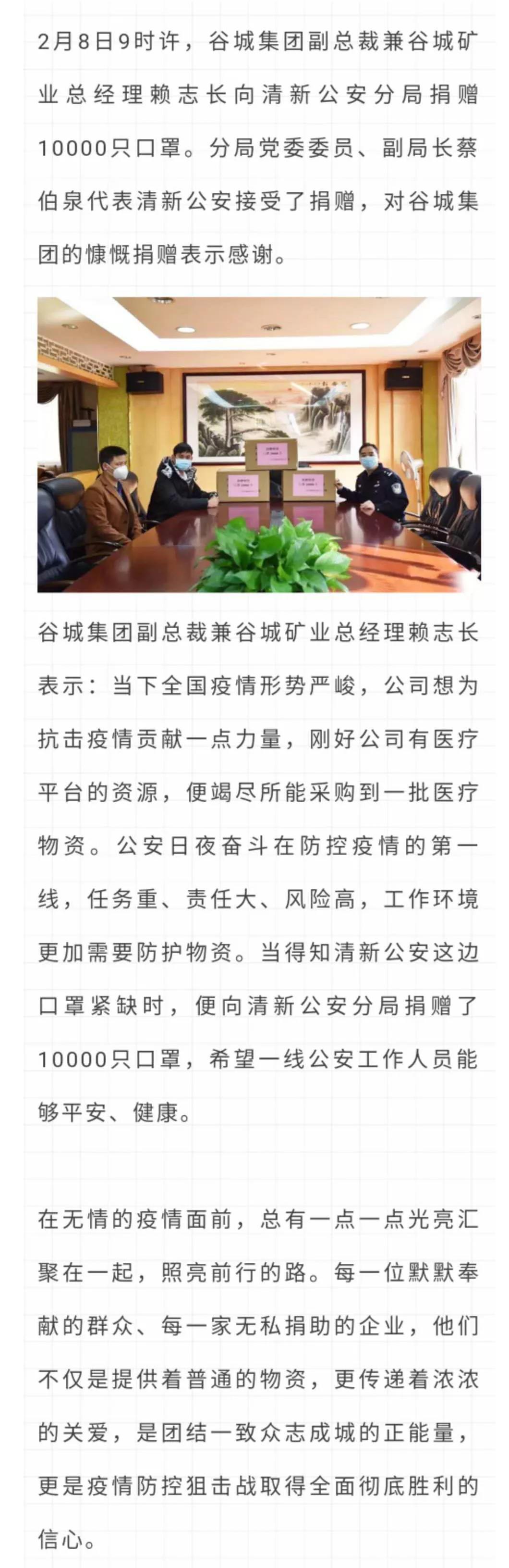 為堅(jiān)決打贏疫情防控阻擊戰(zhàn),清新公安全警動(dòng)員,全力以赴投入疫情防控工作中,每天24小時(shí)輪班執(zhí)勤,守護(hù)全區(qū)人民群眾。疫情無情,人間有情。在清新公安奮戰(zhàn)在抗擊疫情一線時(shí),谷城集團(tuán)副總裁兼谷城礦業(yè)總經(jīng)理賴志長表示:“支持防疫,企業(yè)責(zé)無旁貸?!?/span>